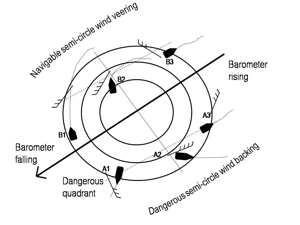 Obtain weather forecasts and track the storm’s position and movement. Try not to rely on one source of information. Wear a life jacket and issue one to all on board, making sure they put them on. Work out the best track to sail (the safe/dangerous semi-circle – see below). Get some sleep before the storm arrives, if you can.
